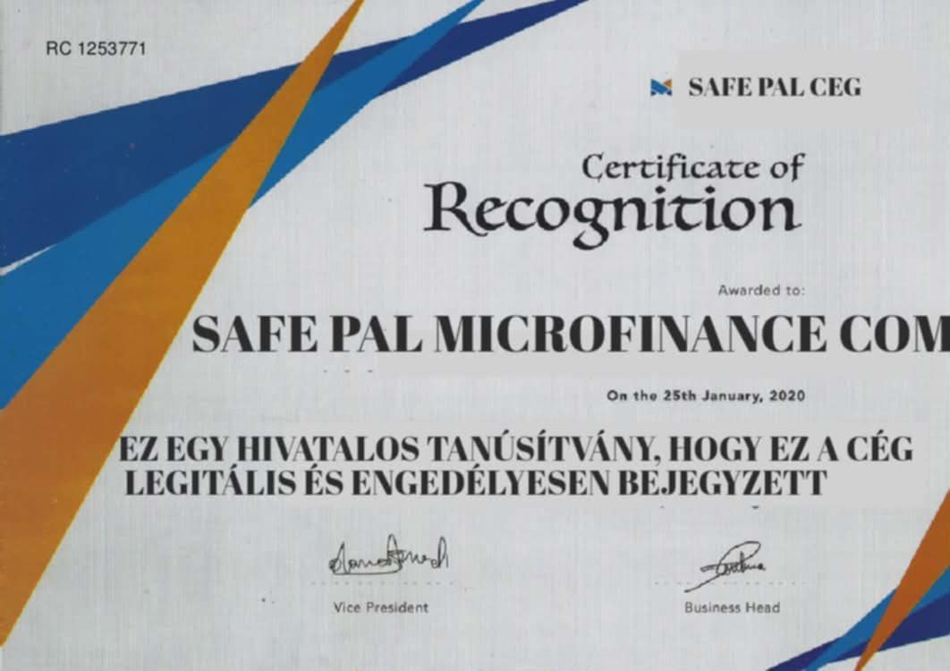 Ez a mondat magyarul van, de a cég neve angol: „SAFE PAL MICROFINANCE COM”